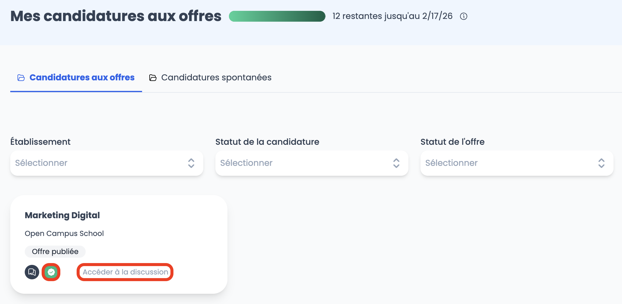 En cliquant sur "Accéder à la discussion" sur la candidature pour laquelle vous souhaitez relancer.