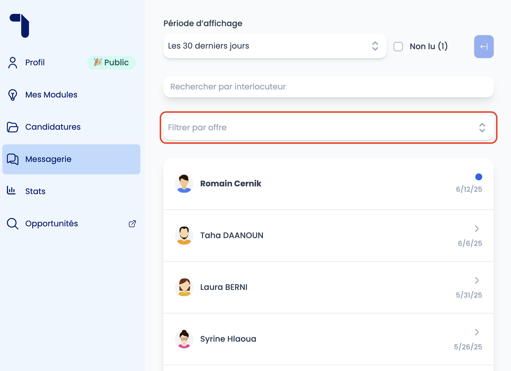 En filtrant les conversations sur l'offre en lien avec la candidature pour laquelle vous souhaitez relancer le recruteur.
